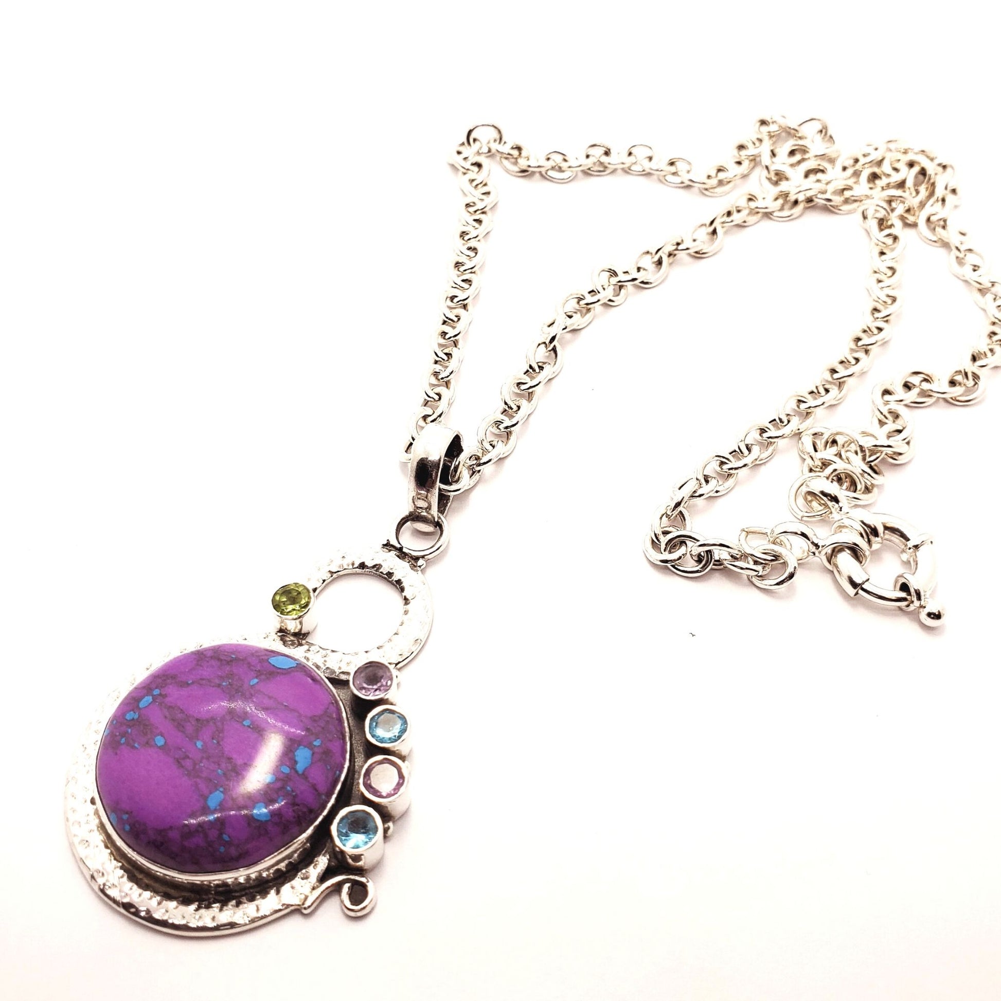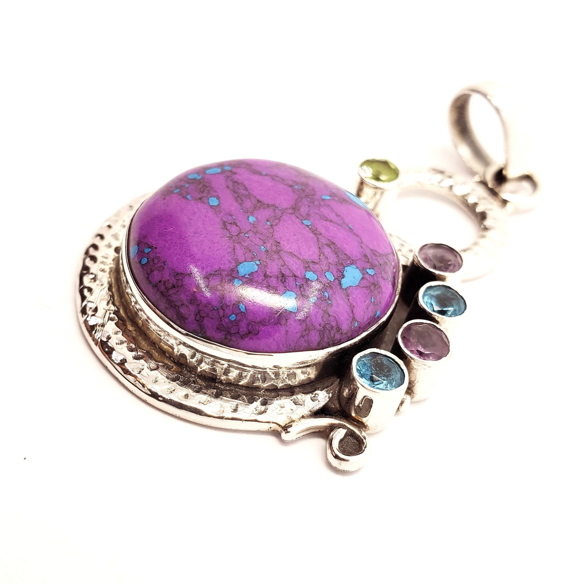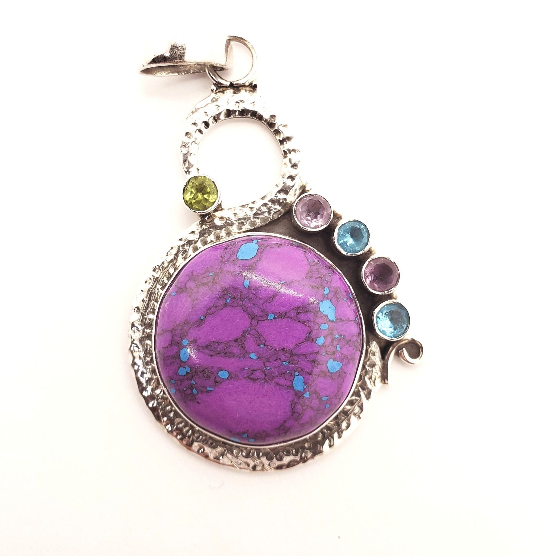 (db55045: .925 Genuine Silver Encased Copper Turquoise stone with silver encased /gemstones topaz and amethyst Colors blue and purple and green Approx. Dimensions: 6cm L including bail, 3.5 cm W Weight: 16.07g)