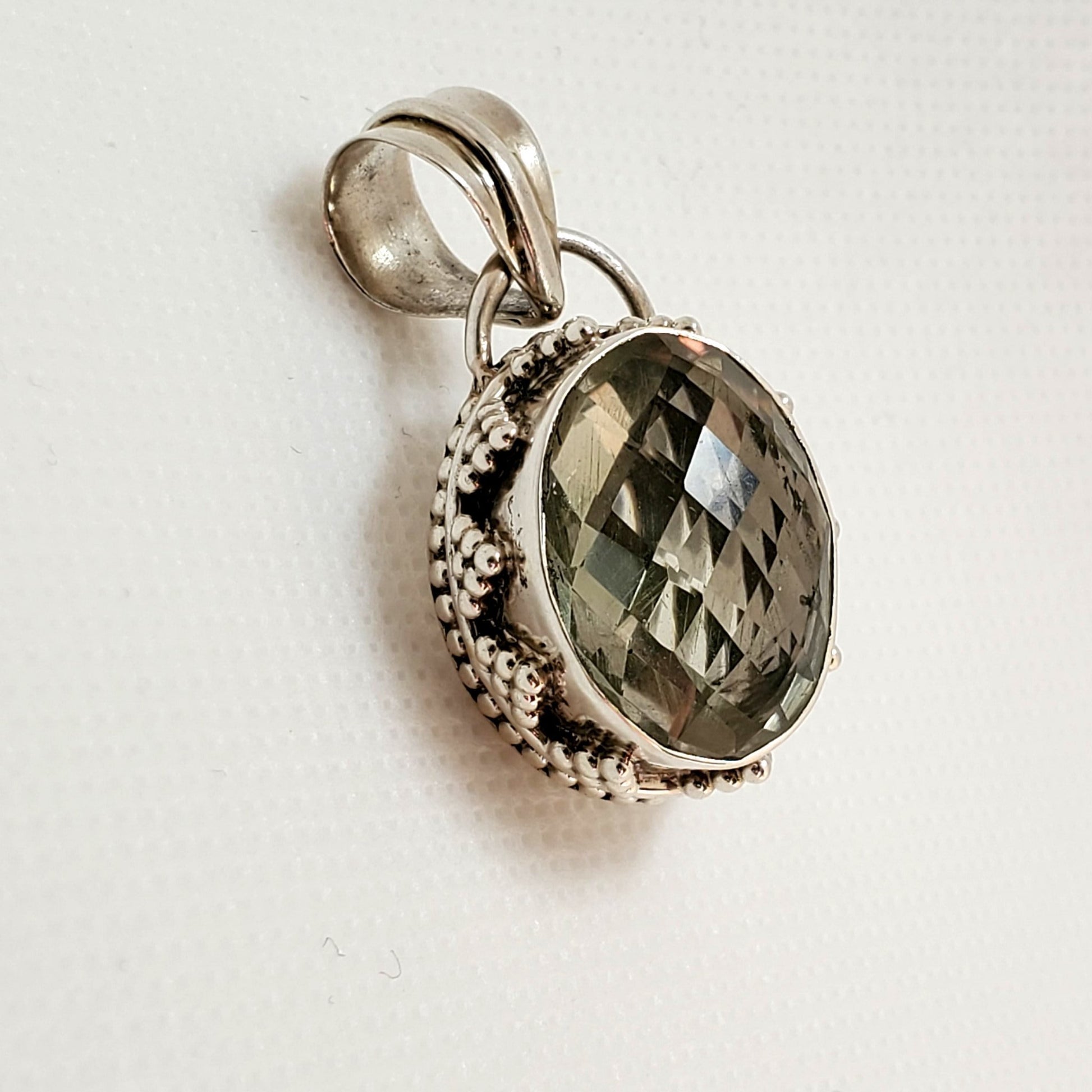 (db55110: 925 Genuine Silver Encased Cushion cut Prasiolite stone with silver bead design adornment /gemstone color green Est. Dimensions: 1.5" long including bail, .75" wide Weight: 12.71g)