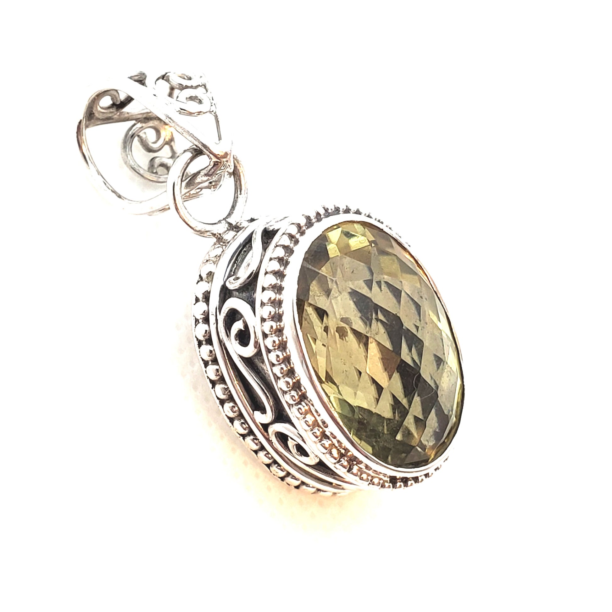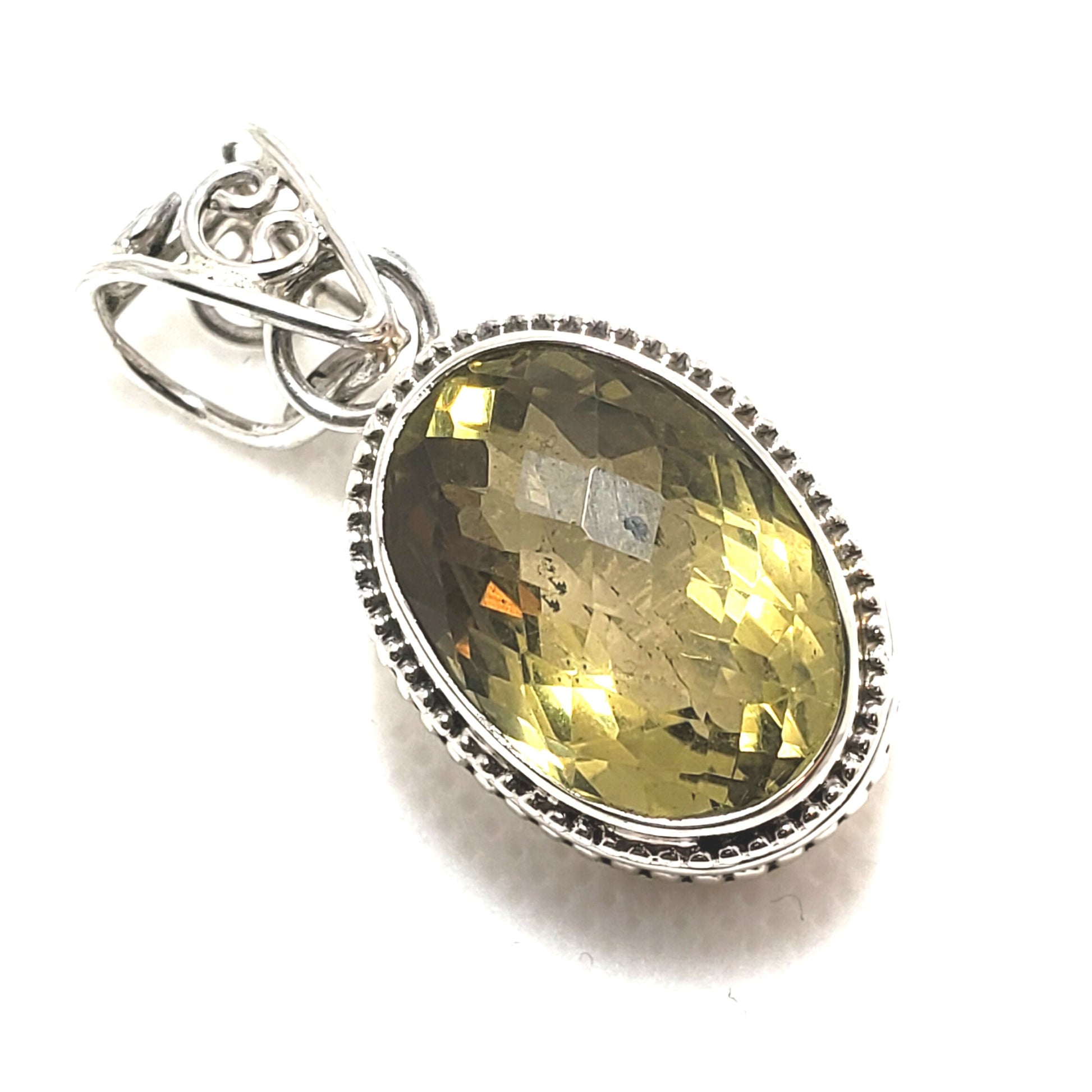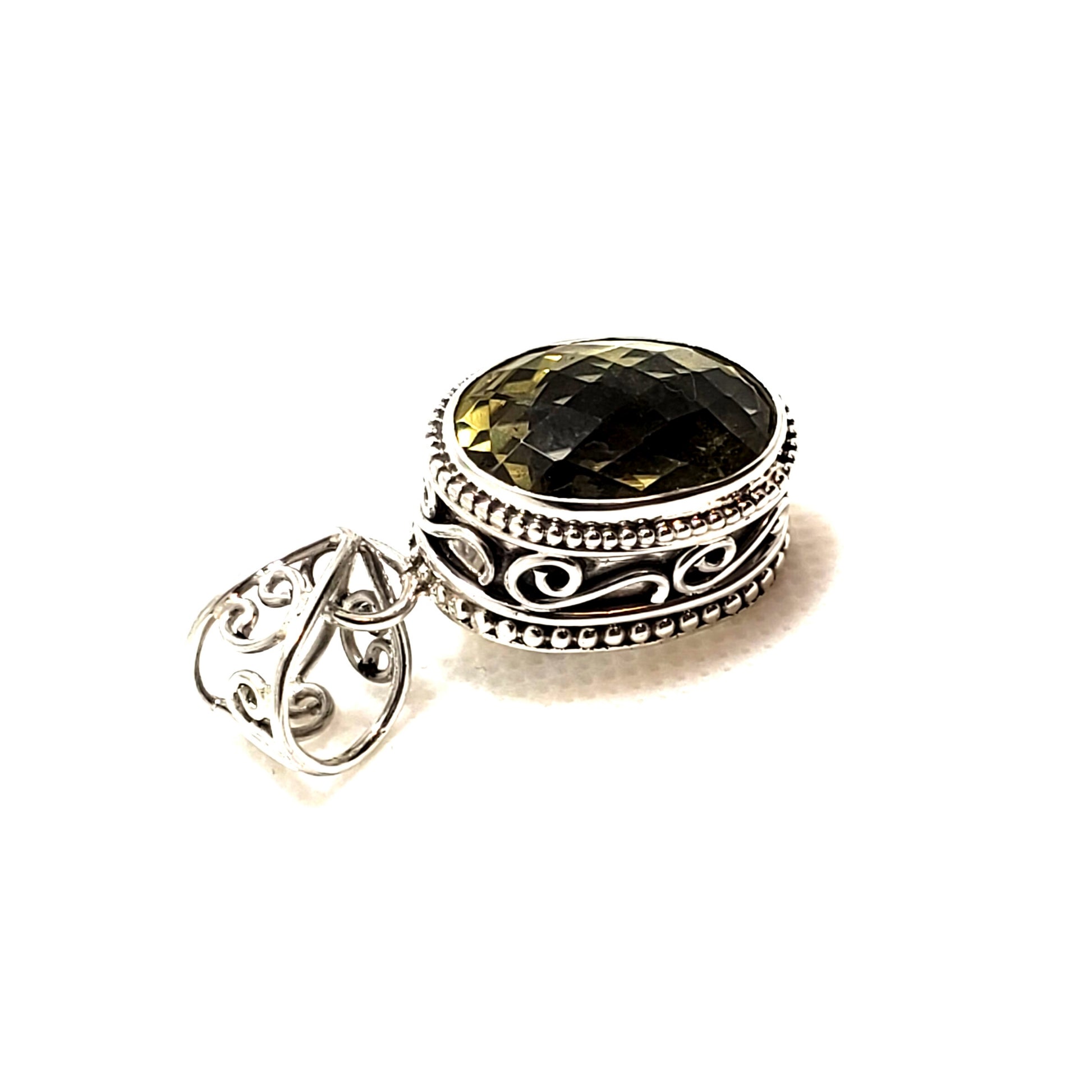 Verde - Lemon quartz is brilliant. People who are enthusiastic and happy are almost always attracted to this sparkly gem. It is one of the most refreshing and uplifting stones. Some say it brings the wearer abundance and luck! And it is believed to assist anyone going through a change with a positive outlook. The genuine silver casing is a beautiful and intricate scroll design that is carried into the cut out bail. There is also the touch of silver beading on the top and bottom for a more