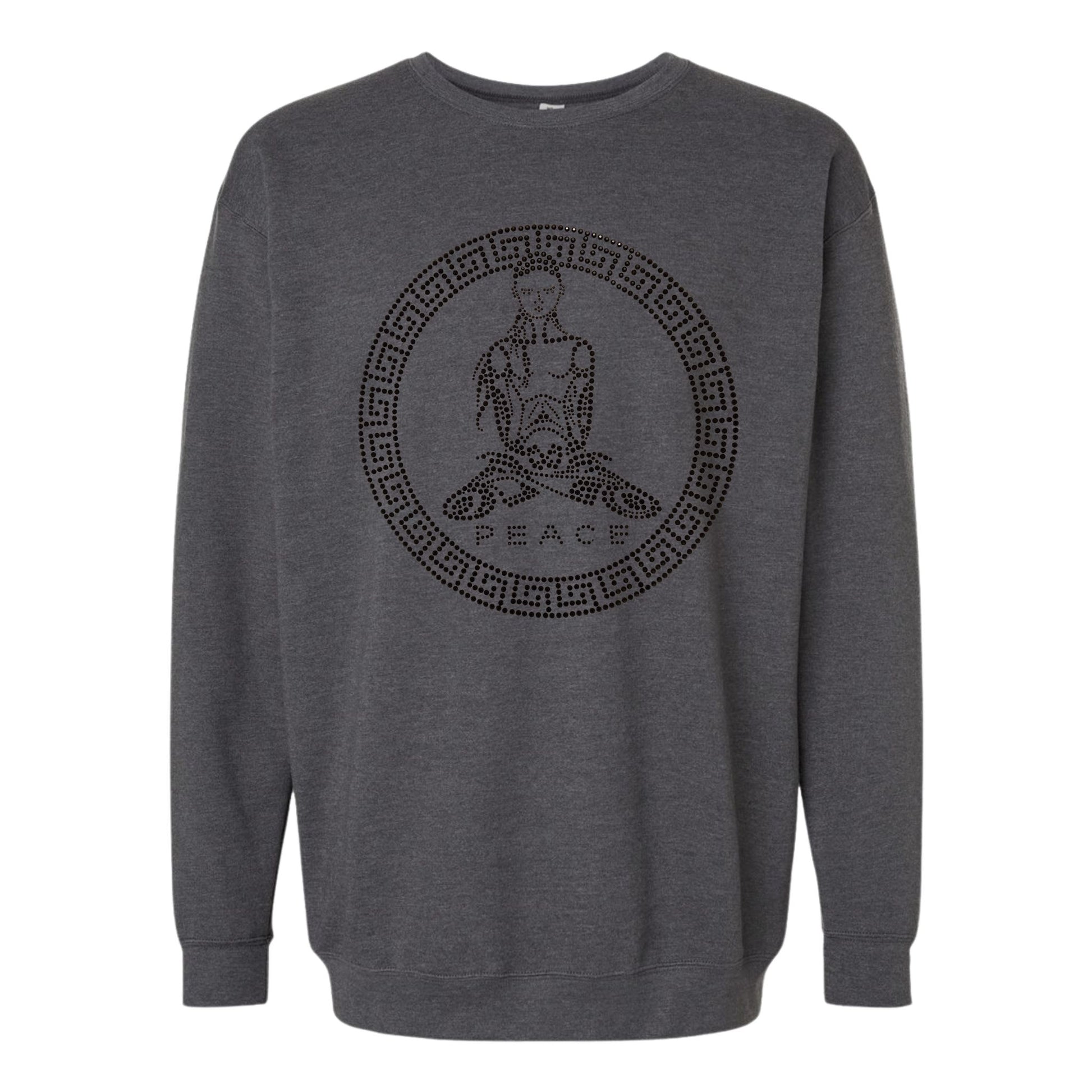 Artifaax’s signature Peace Crewneck features a one-of-a-kind crystal design—a serene, feminine figure seated in quiet strength and grace. Inspired by West Coast artistry and the natural poise of designer Denise Brillon’s daughter, this motif radiates peaceful power. A bold circle of black rhinestones frames the form, catching the light and elevating any outfit with subtle sparkle.
