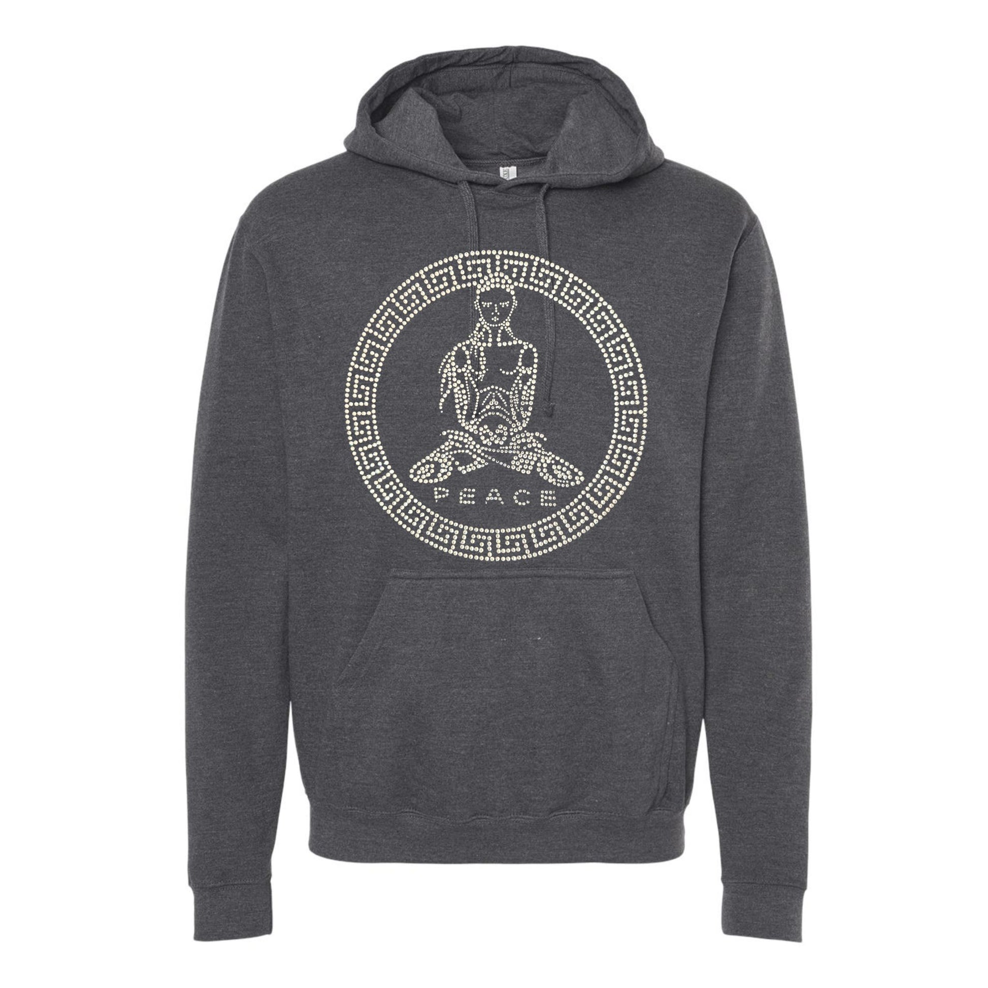 Artifaax’s signature Peace hoody features a one-of-a-kind crystal design—a serene, feminine figure seated in quiet strength and grace. Inspired by West Coast artistry and the natural poise of designer Denise Brillon’s daughter, this motif radiates peaceful power. A bold circle of black rhinestones frames the form, catching the light and elevating any outfit with subtle sparkle.